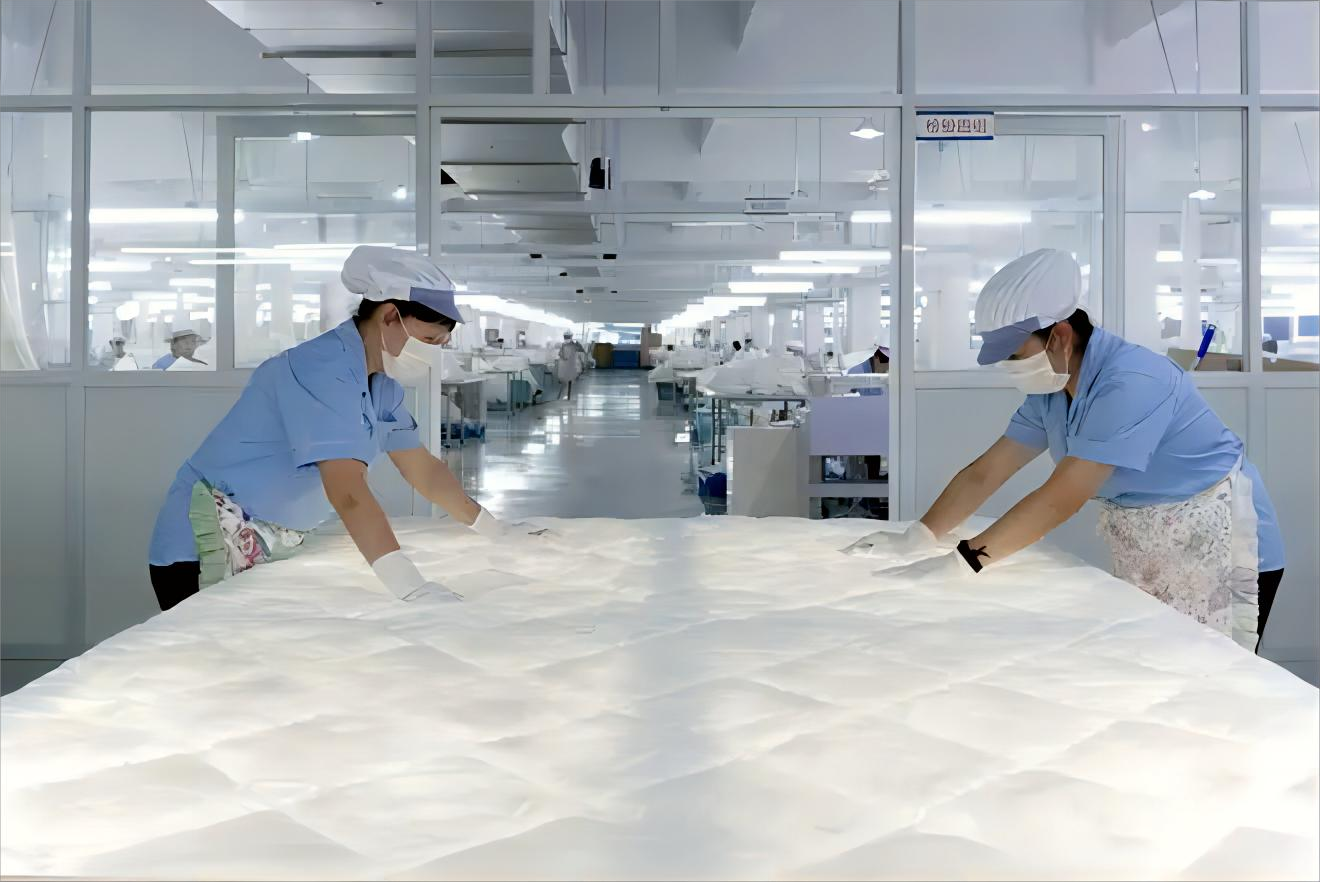 羽绒车间是打造高品质酒店羽绒布草的核心地带,每一件从这里诞生的产品,都凝聚着对品质的执着与对温暖的追求。专业的质检人员运用丰富的经验和精密的检测仪器,对每一批羽绒进行细致检测。从含绒量、绒子含量,到蓬松度、清洁度等关键指标,都逐一严格把关,只有各项指标均达标的羽绒,才有资格进入后续的处理工序。现代化的填充设备在电脑的精准控制下,能够根据不同产品的规格和设计要求,将羽绒均匀、定量地填充到被芯、枕芯等产品中。瑞棉羽绒车间,凭借精湛的工艺、先进的设备和严格的质量管控,为酒店打造出兼具温暖与舒适的高品质羽绒布草。